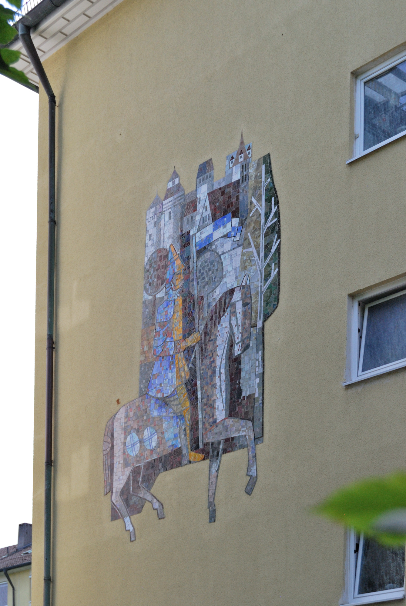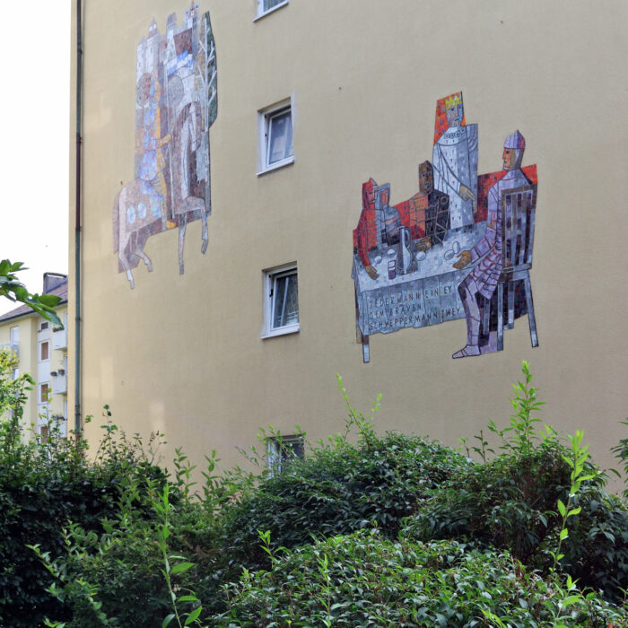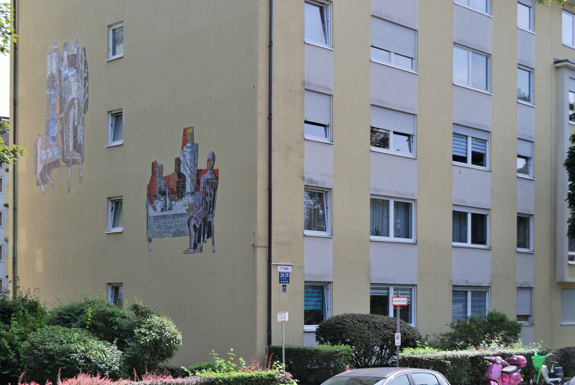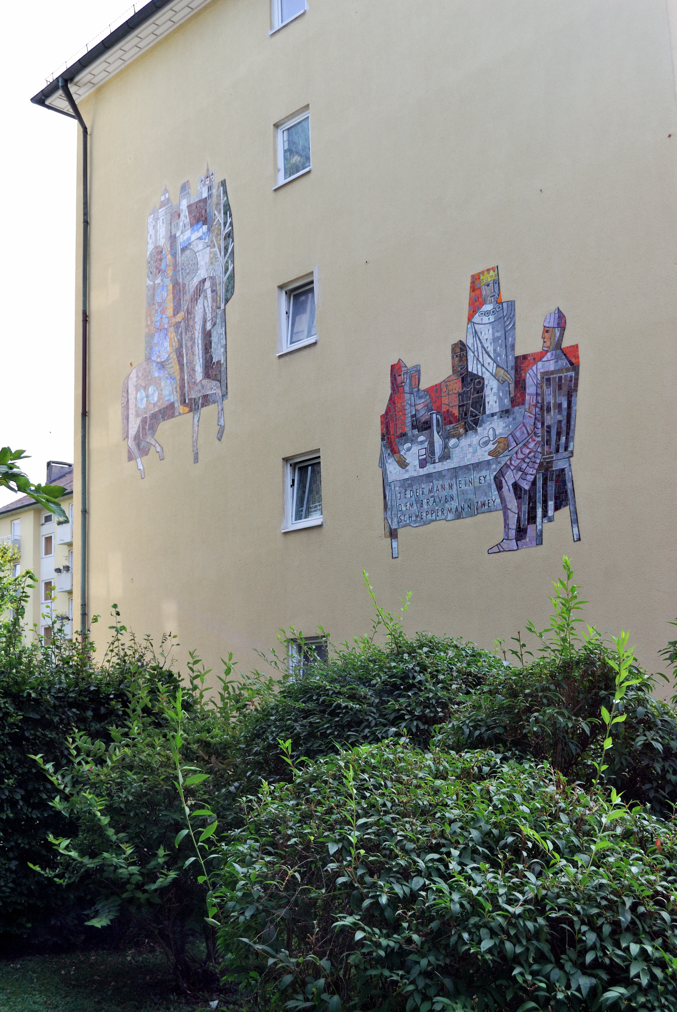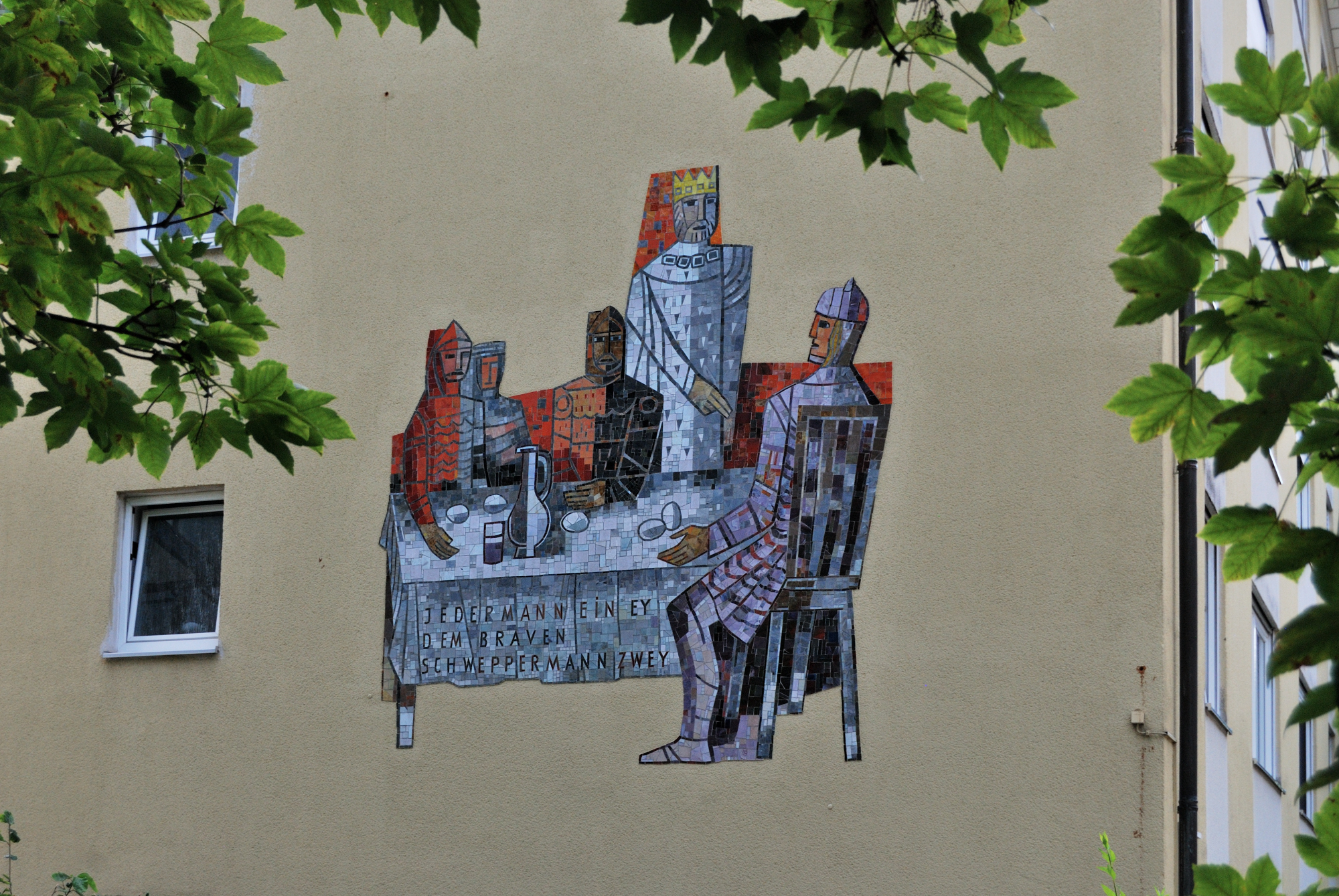 Keramikmosaik Trausnitzstraße 20 und Wandmalerei Trausnitzstraße 36. Die Wandmalerei wurde wohl angebracht, nachdem das darunterliegende Mosaik durch aufgebrachte Dämmplatten verdeckt wurde. Der Text auf dem rechten Keramikmosaik am Haus Trausnitzstraße 20 lautet: „Jeder Mann ein Ey, dem braven Schweppermann zwey“. Damit wird der Bezug zur nahegelegenen Schweppermannstraße, einer Querstraße der Trausnitzstraße, hergestellt. Ritter Seyfried Schweppermann (um 1260-1337) war ein bayerischer Heerführer in den Schlachten von Ampfing. Kaiser Ludwig der Bayer soll ihn nach der Schlacht von Ampfing und Mühldorf mit den Worten ausgezeichnet haben: „Jedem Mann ein Ei, dem frommen Schweppermann zwei“ (zitiert nach „Münchens Straßennamen“, Verlag J. Berg, München 1983).