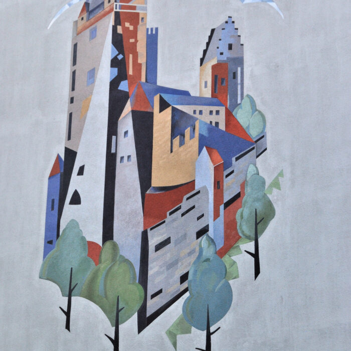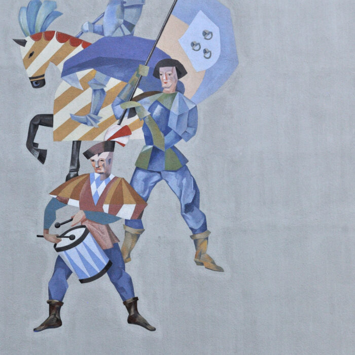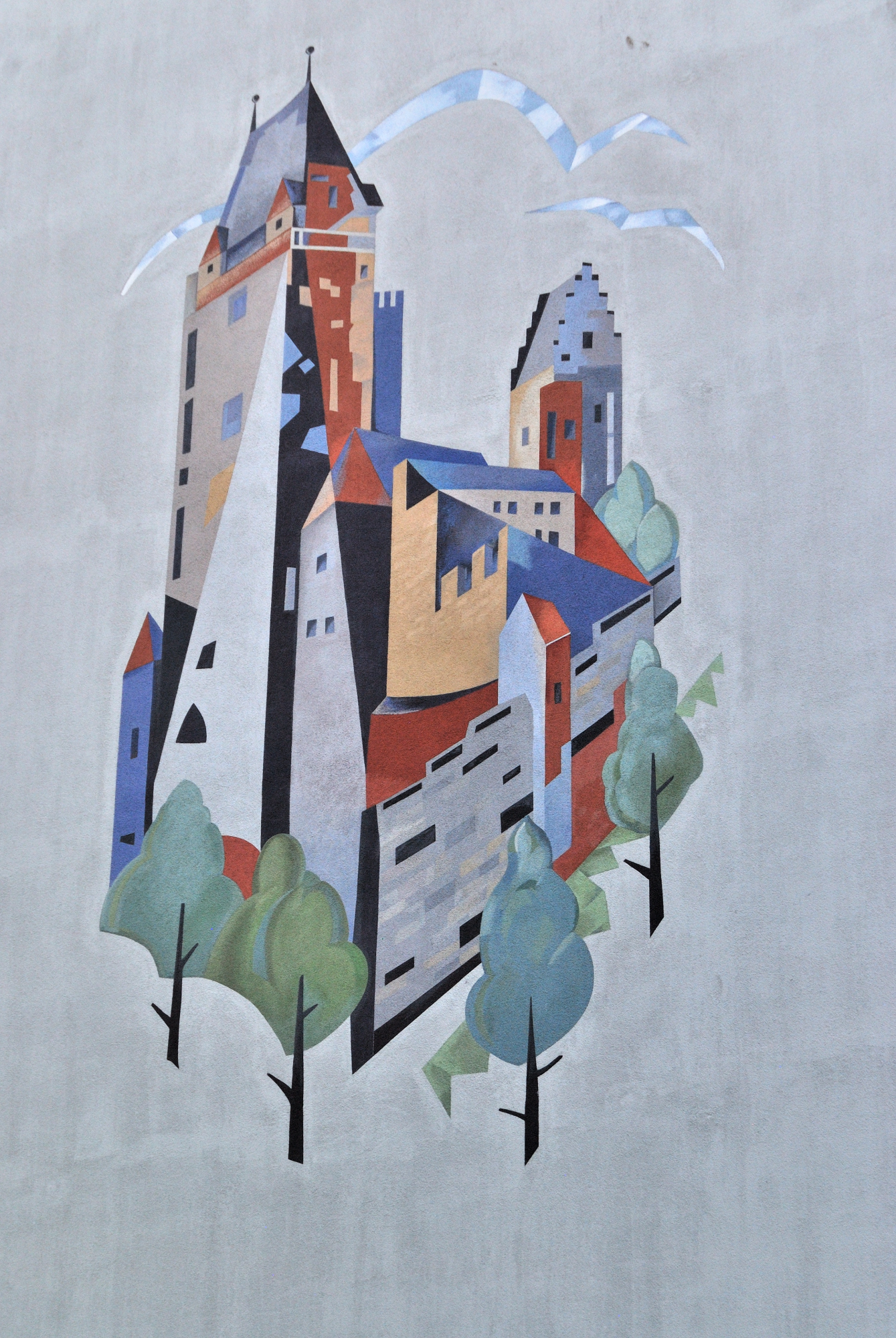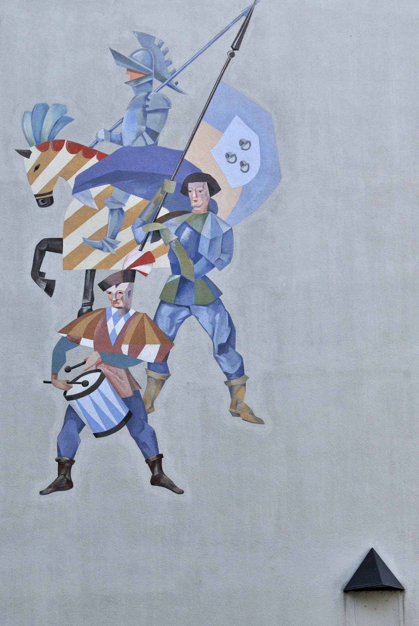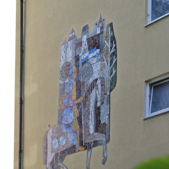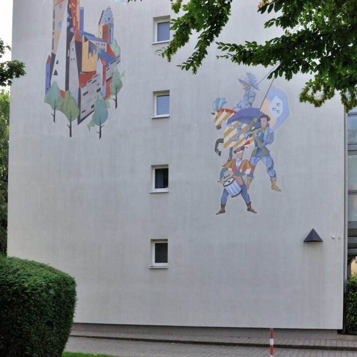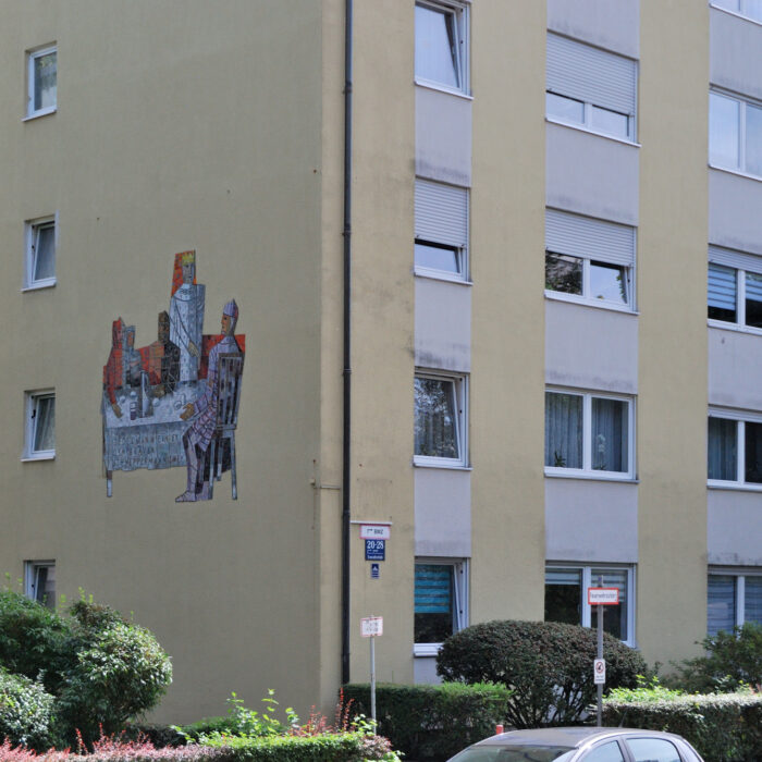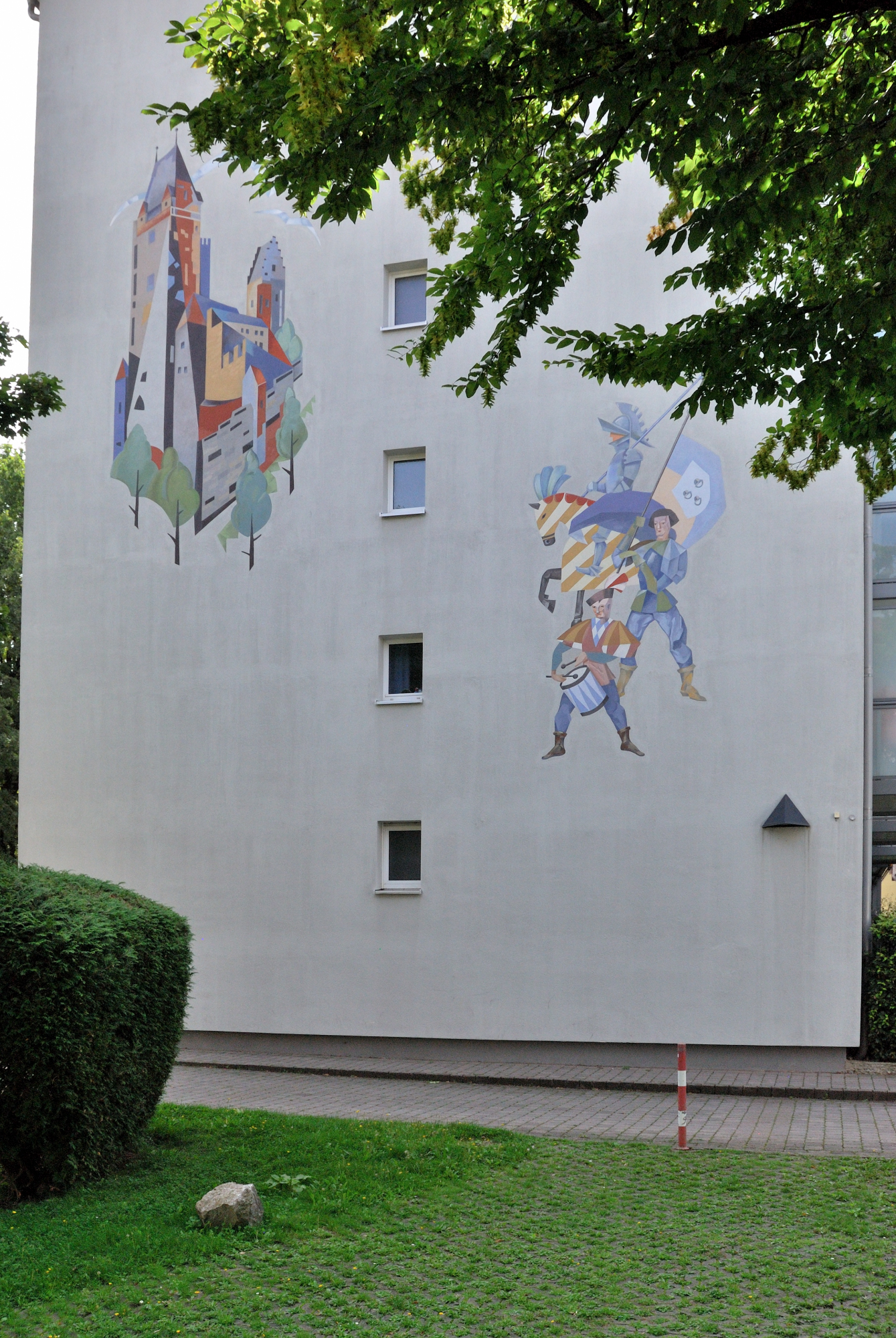 Keramikmosaik Trausnitzstraße 20 und Wandmalerei Trausnitzstraße 36. Die Wandmalerei wurde wohl angebracht, nachdem das darunterliegende Mosaik durch aufgebrachte Dämmplatten verdeckt wurde. Der Text auf dem rechten Keramikmosaik am Haus Trausnitzstraße 20 lautet: „Jeder Mann ein Ey, dem braven Schweppermann zwey“. Damit wird der Bezug zur nahegelegenen Schweppermannstraße, einer Querstraße der Trausnitzstraße, hergestellt. Ritter Seyfried Schweppermann (um 1260-1337) war ein bayerischer Heerführer in den Schlachten von Ampfing. Kaiser Ludwig der Bayer soll ihn nach der Schlacht von Ampfing und Mühldorf mit den Worten ausgezeichnet haben: „Jedem Mann ein Ei, dem frommen Schweppermann zwei“ (zitiert nach „Münchens Straßennamen“, Verlag J. Berg, München 1983).